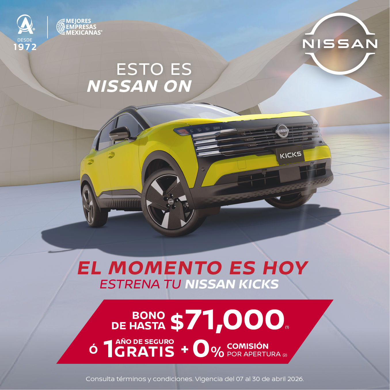 Se aplica para KICKS PLATINUM '26 en plan tradicional Credi Nissan. (2) Aplica para todas las versiones KICKS '26 en operaciones de crédito celebradas con Credi Nissan. No aplica con otras promociones ni en compra de flotillas. Para conocer planes y modalidades de crédito, verificar precios, requisitos de contratación, comisiones, disponibilidad, términos y condiciones, consulta a tu Distribuidor Autorizado Nissan. Vigencia del 07 al 30 de abril 2026.